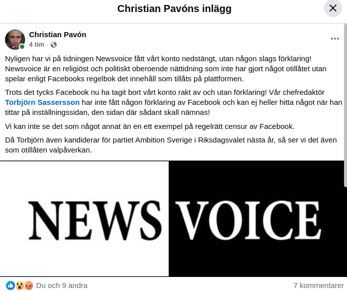 We can only see this as an example of outright censorship by Facebook. As Torbjörn is also standing as a candidate for the Ambition Sweden party in next year’s general election, we also consider this to be unlawful election interference.