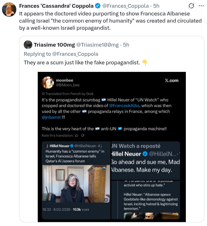 Francesca Albanese can use this to say that she hasn’t accused Israel of being a safe-haven for Satanic pedos, nor has she blamed Israelis for celebrating dead Gaza toddlers, and just go on with the list of truths that she hasn’t said.