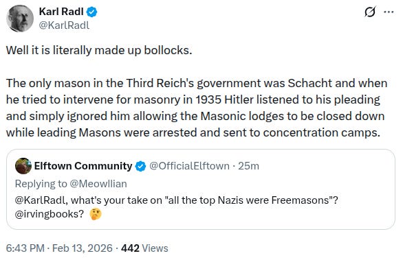 Karl Radl is not only very knowable, but also very careful to not get stuff wrong. So I trust him, but the idea that NSDAP shut down competing Masonic Lodges is absurd. Absurd things do happen, but this didn’t.