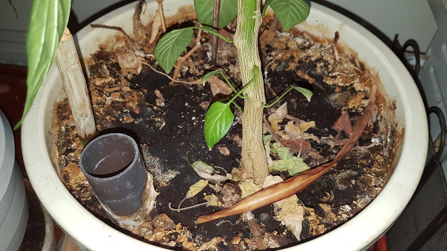 For you interested in bio-chemistry or just growing stuff: There is a lot of fungi in that pot that seem to help the plant grow like crazy compared to the exactly same seeds in similar soil in the same place.