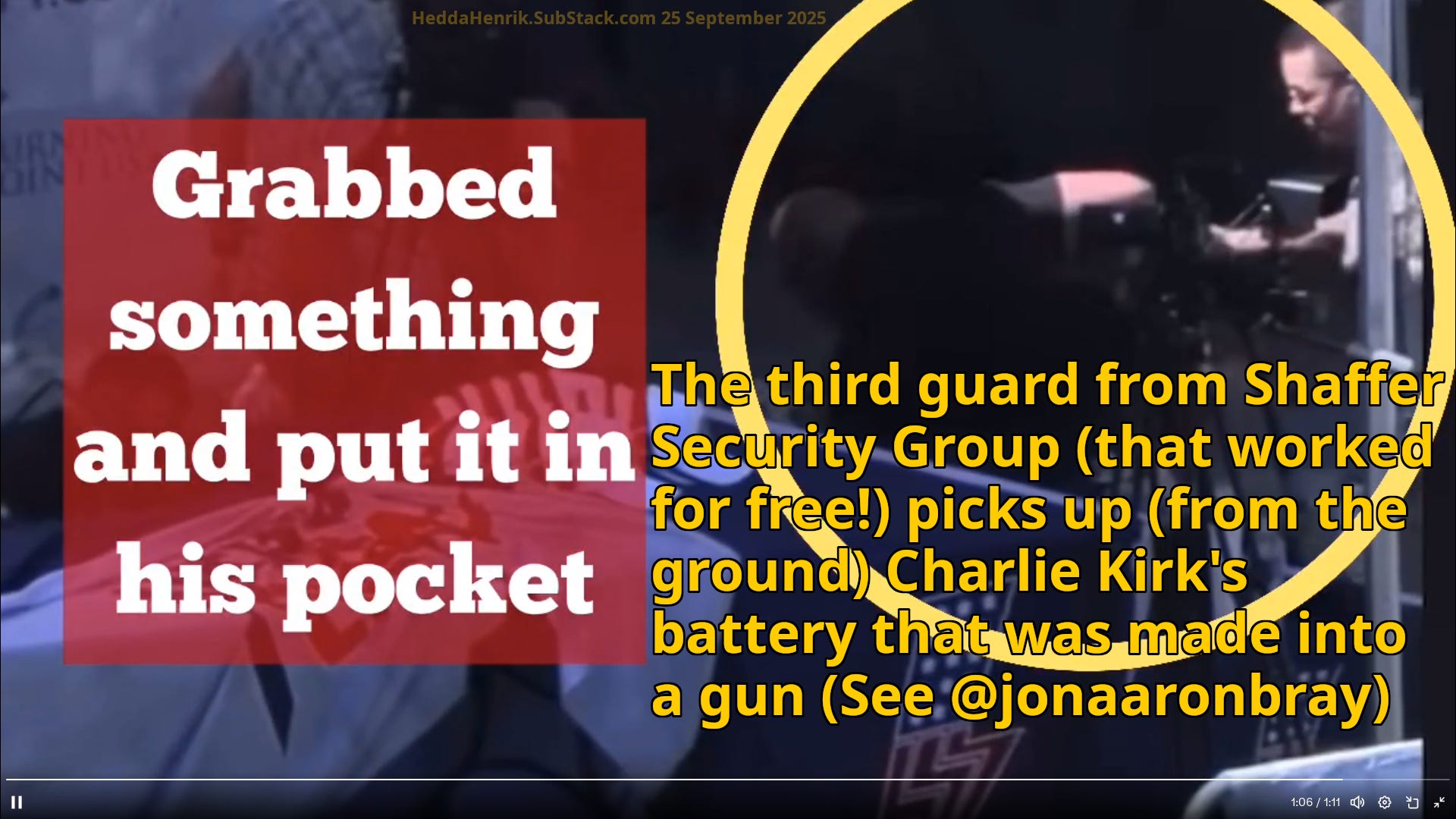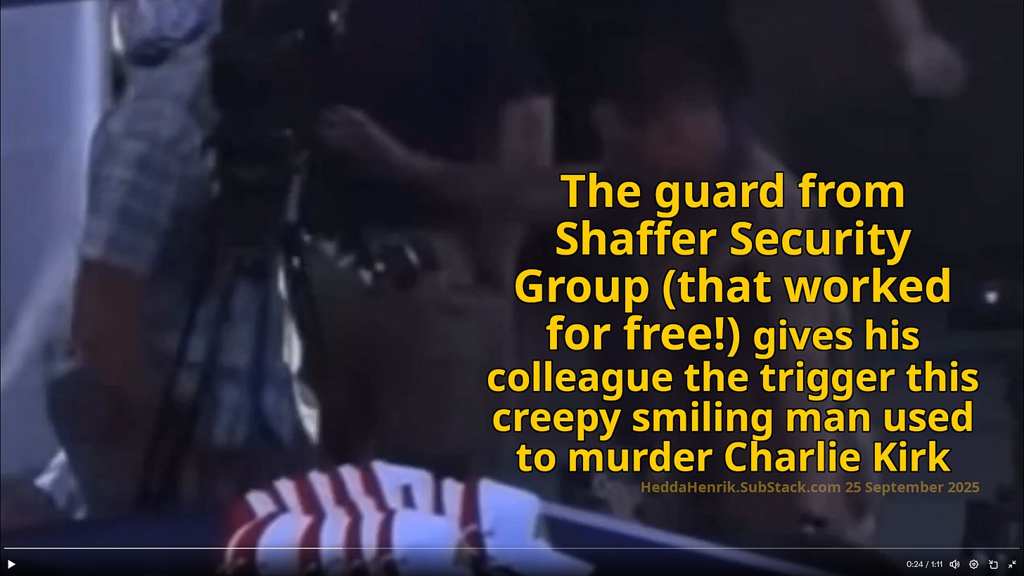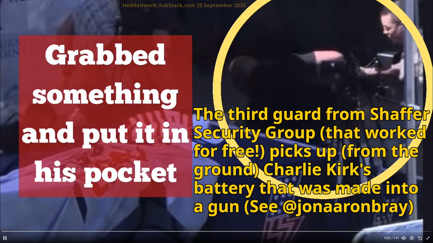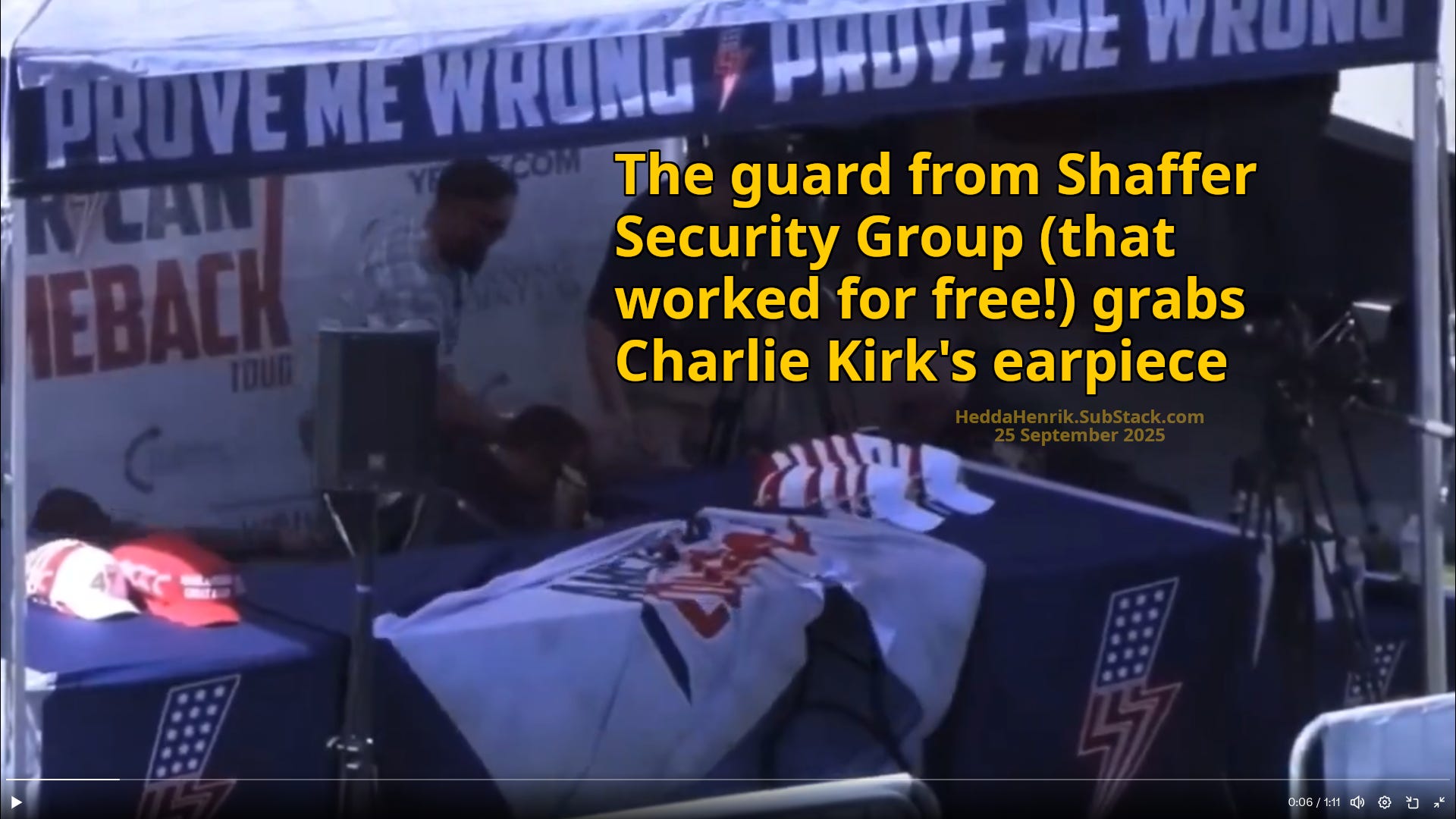 The video is here or on Rumble: How Shaffer Security Group WORKED FOR FREE and murdered Charlie Kirk