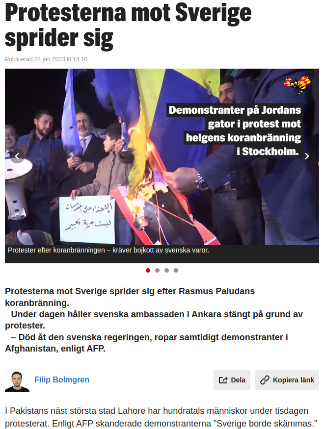 So instead they are busy protesting that a Dane burnt a book in Sweden. This is of course not real, but a psy-op from the deep criminal global state. It might be a threat against Sweden’s deep state: